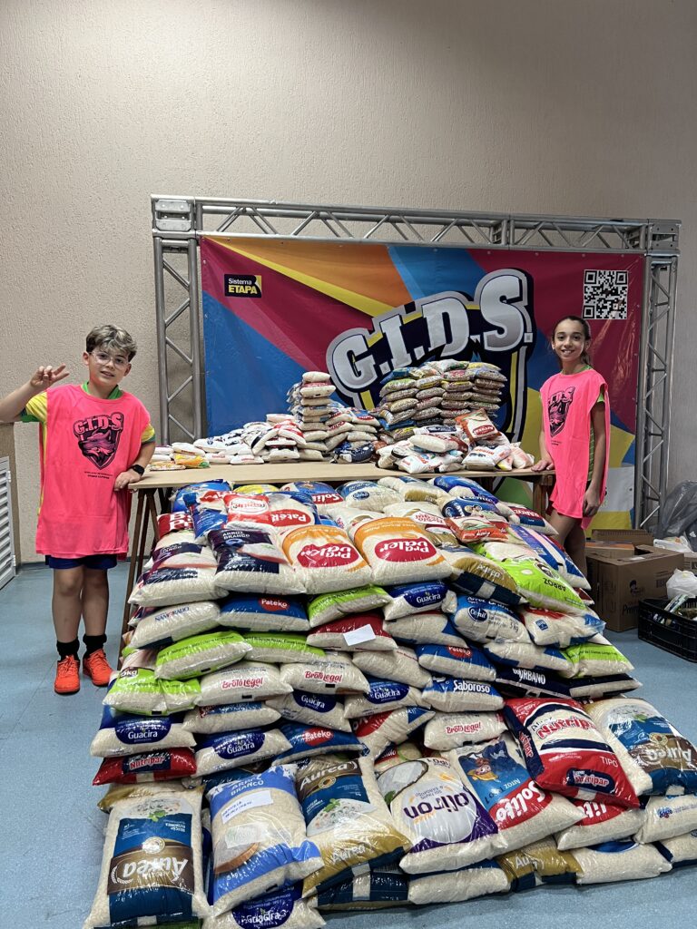 Como acontece todos os anos, o GIDS 2025 também foi marcado por uma ação solidária de grande impacto. Cada equipe mobilizou alunos e famílias para arrecadar alimentos e produtos de higiene, somando aproximadamente 2 toneladas em doações. Todo o material foi destinado a instituições parceiras do colégio: Associação e Comunidade Casa de Nazaré, UNICANCER, Lar Creche Wilson de Oliveira.