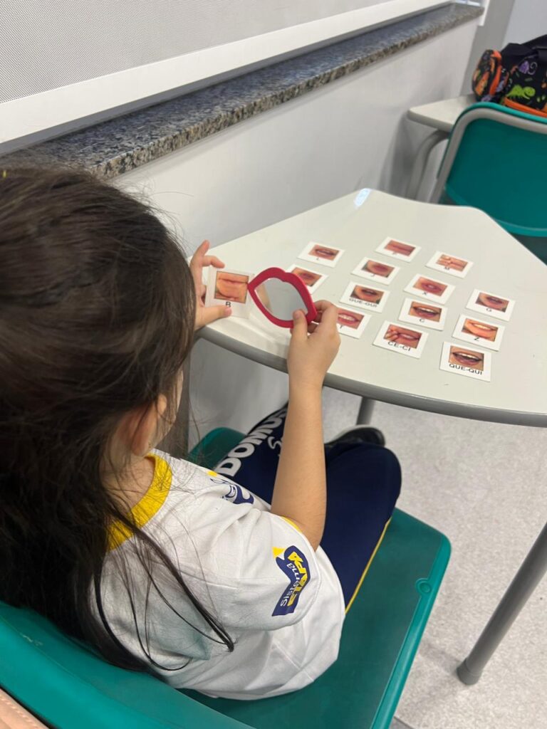 - uso de espelhos para que as crianças possam observar articulação da boca ao pronunciar as letras ou sílabas.